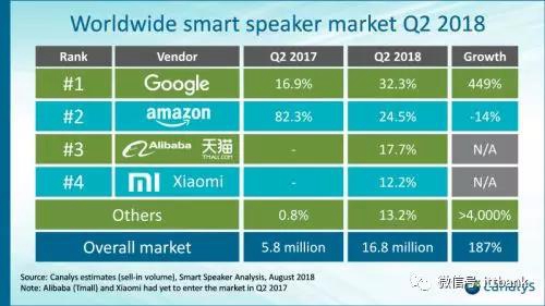 据国外媒体VentureBeat报道,市场调研公司Canalys发布的报告显示,2018年第二季度,全球完美网页版音箱出货量增长了187%。苹果、谷歌、小米、亚马逊等公司的完美网页版音箱总出货量为1680万台,高于第一季度的900万台。